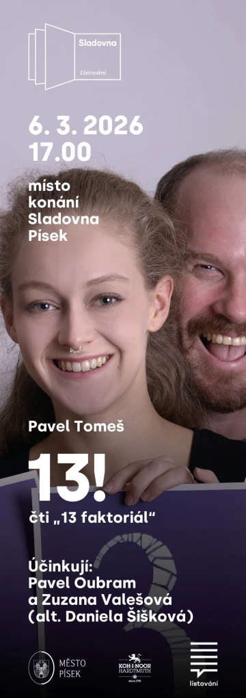 Spisovatel, nakladatel, stand-up komik a fanda faktoriálu Pavel Tomeš napsal mozaiku povídek, která jasně ukazuje, že žádná tma není tak temná, aby ji neprozářil černý humor. Autor známého románu o smrti Až na ten konec dobrý získal s Třináctkou Cenu Miloslava Švandrlíka a také nominaci Magnesia Litera v kategorii humoristická kniha. Přijďte se na Listování přesvědčit, že 13! je šťastné a zábavné číslo.